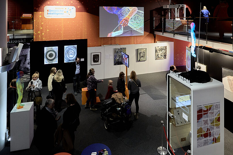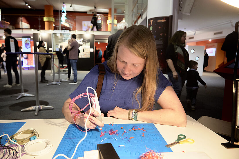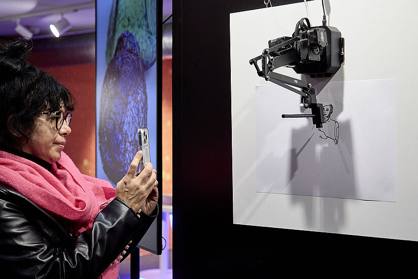 Ein Roboterarm konnte währenddessen durchgehend in künstlerischer Aktion erlebt werden. Strich für Strich brachte der unscheinbar wirkende maschinelle Zeichner unter den Augen der Museumsgäste beispielsweise ein Portrait des humanoiden Roboters AMECA zu Papier. Nicht zuletzt konnten die Besucherinnen und Besucher auch ihre eigene Kreativität ausleben: Eine 3D-Druckstift-Station bot Groß und Klein die Möglichkeit, eigene Skulpturen zu erschaffen.