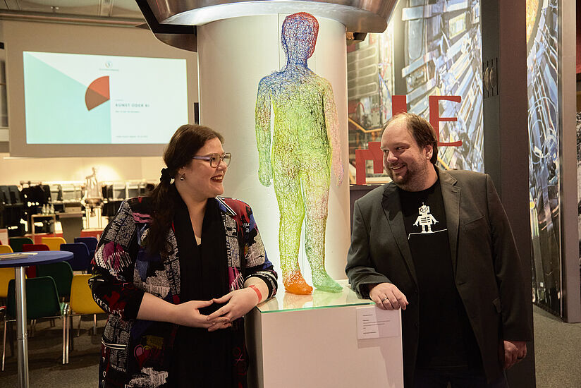 »Eine Künstliche Intelligenz, also eine Maschine, arbeitet in Perfektion und wesentlich schneller als ein Mensch«, beschreibt Künstlerin Lena Reifenhäuser die Ideen, die der Ausstellung »Kunst oder KI: Wer ist der Künstler?« zu Grunde lagen. »Aber sind es nicht genau unsere kleinen menschlichen ›Fehler‹ oder Abweichungen, die etwas überhaupt zu Kunst machen?« In ihrem gemeinsamen Ausstellungsprojekt beleuchteten die Künstlerin und der Roboter-Enthusiast Sebastian Trella dieses spannende Thema im Deutschen Museum Bonn auf vielfältige Weise aus dem Blickwinkel Kunstschaffender.