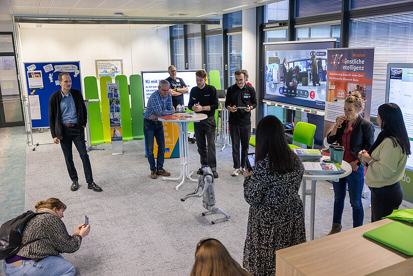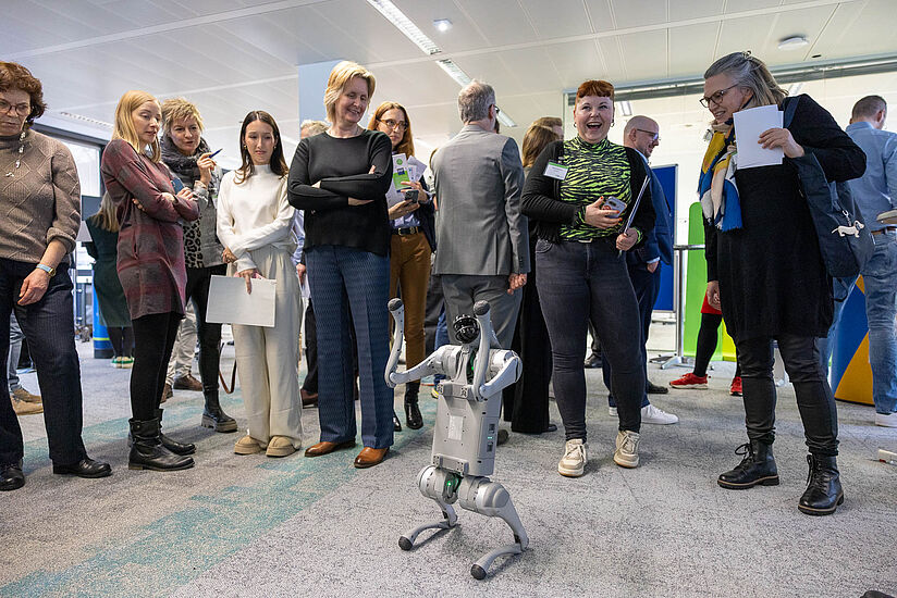 Ein besonderer Bestandteil der Bildungskonferenz war die begleitende KI-Erlebniswelt, die im Lesesaal des BIBB stattfand. Hier hatten die mehr als 150 Teilnehmenden die Möglichkeit, Künstliche Intelligenz interaktiv zu erleben und aktuelle Anwendungen kennenzulernen. Roboterhund »Hus:KI« führte hier nicht nur seine beeindruckenden Kunststücke auf, er regte auch zur Diskussion über die Janusköpfigkeit der Technologie an: Hundeähnliche Laufroboter wie er können dank KI beispielsweise eingesetzt werden, um verschüttete Menschen in Erdbebengebieten finden - aber auch als Kampfdrohen urbane Schlachtfelder bevölkern.