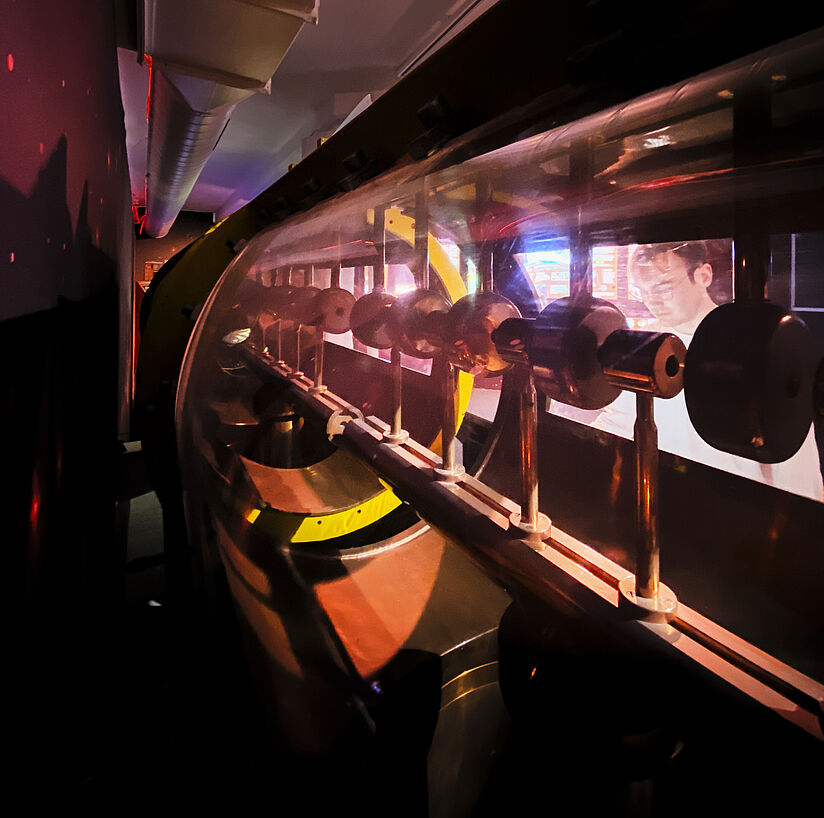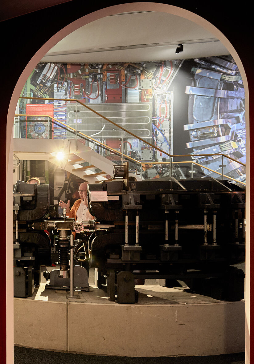 Im Erlebnisraum zur Teilchen- und Beschleunigerphysik »Elementares: Besuch im Teilchenzoo« der Mission KI können Museumsgäste in die faszinierende Welt der kleinsten Teilchen eintauchen. Hinter dem Exponat Teilchenbeschleuniger 500 MeV Elektronen-Synchrotron können sie sich über das Leben und Werk von Wolfgang Paul informieren. Bild: Deutsches Museum | Eric Alexander Lichtenscheidt