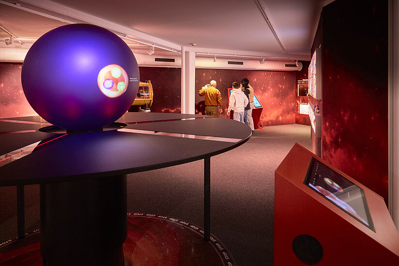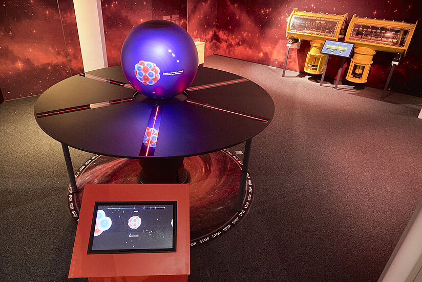 Schon am Eingang des neuen Erlebnisraumes erwartet ein echter Hingucker die Besucher und Besucherinnen. Ein hell strahlender Globus stellt die wichtigsten Insassen des Teilchenzoos eindrucksvoll vor: Wie muss man sich Atome und ihre Bestandteile vorstellen? Was hat es mit Protonen, Neutronen und Elektronen auf sich und wer oder was sind Elementarteilchen?