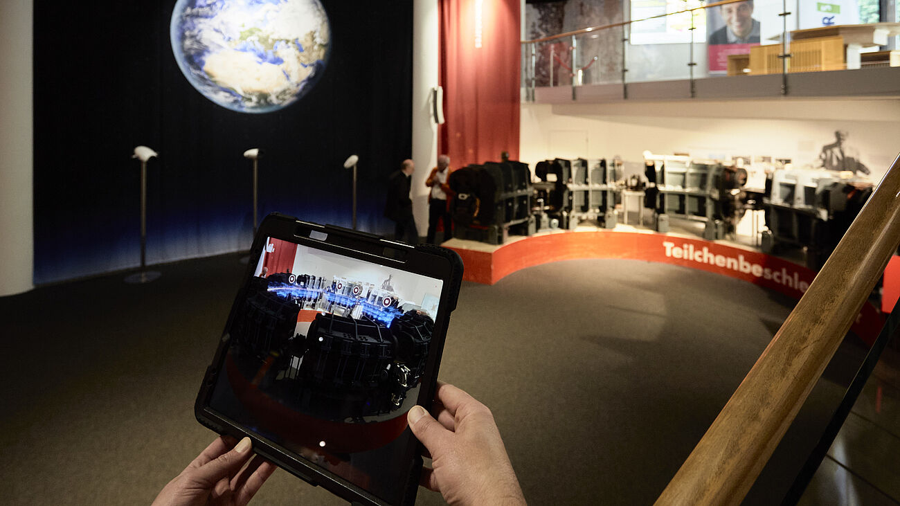 Mit »Augmented-Reality« wird der Ring des Synchrotrons digital geschlossen und der umlaufende Elektronenstrahl sichtbar. So wird dieses historische Ausstellungsstück wieder lebendig!