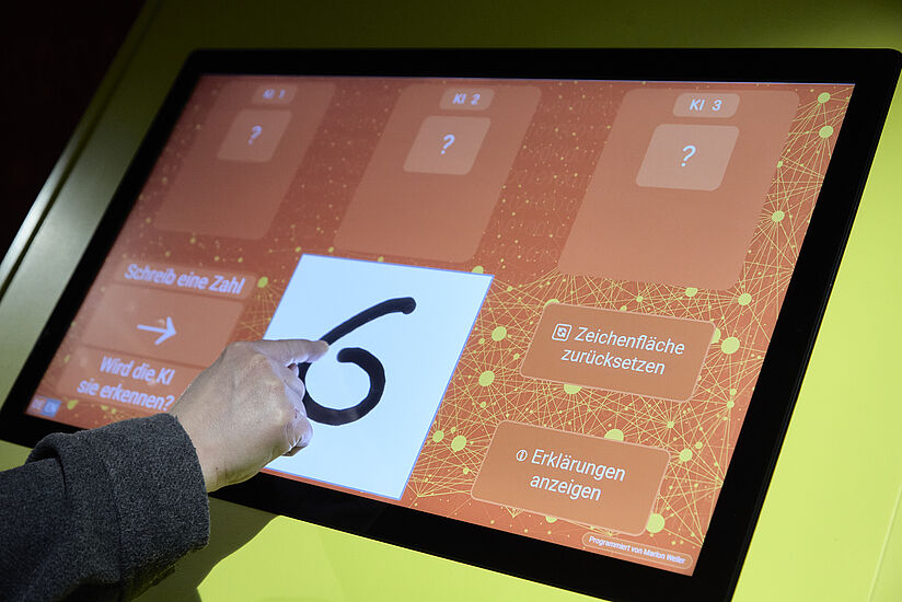 An dieser Station versuchen drei KIs handgeschriebene Zahlen zu erkennen. Nachdem eine Zahl auf das Touchfeld geschrieben wird, können die Besucher und Besucherinnen sehen, wie drei unbterschiedlich gut trainierte KIs gleichzeitig versuchen, die Zahl zu erkennen. Die KIs wurden mit 10, 100 oder 3.000 Beispielzahlen trainiert. Je besser die KI trainiert ist, desto besser erkennt sie die Zahl.