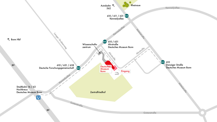 Bitte rechnen Sie mit zehn Minuten für den Fußweg von der Stadtbahn-Haltestelle Hochkreuz/Deutsches Museum Bonn bis zum Museum. Abspanner leiten Sie entlang der Kennedyallee und der Ahrstraße.