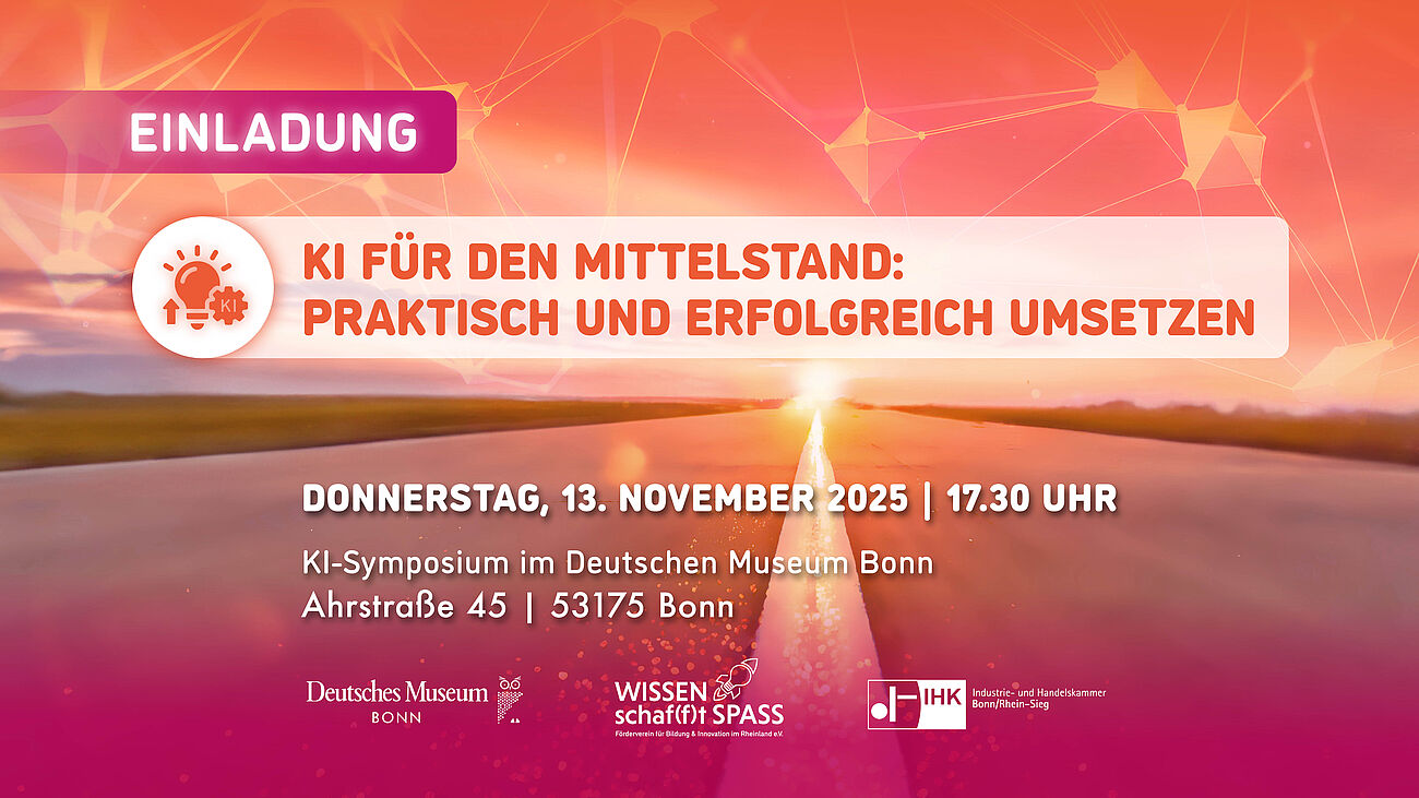 Die Veranstaltung wird gemeinsam organisiert von WISSENschaf(f)t SPASS – Förderverein für Bildung und Innovation im Rheinland e.V. und der IHK Bonn/Rhein-Sieg und richtet sich insbesondere an Unternehmer:innen und mittelständische Unternehmen aus dem Rheinland. Das Ziel dieser Veranstaltung ist es, einen Einstieg in das Thema KI für den Mittelstand zu bieten, Beispiele aus der Praxis kennenzulernen, Erfahrungen auszutauschen und Orientierung zu geben. Und wo geht das besser als im Deutschen Museum Bonn – dem Forum für Künstliche Intelligenz!