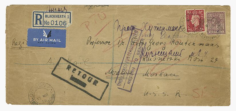 Brief mit Zensurstempeln und dem Vermerk „Empfänger unbekannt“ - Vorderseite. Bild: Deutsches Museum
