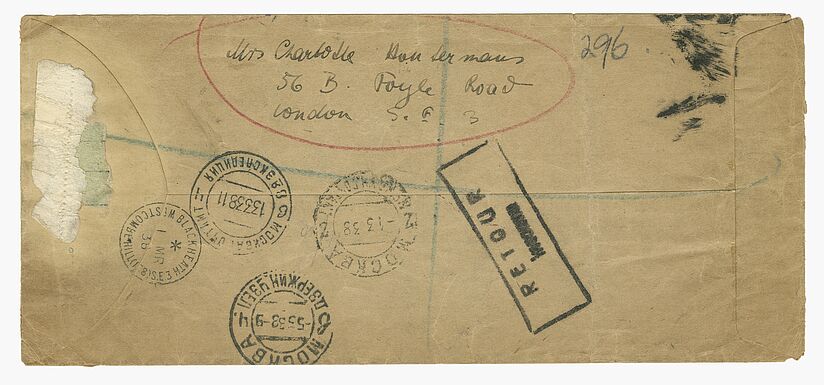Brief mit Zensurstempeln und dem Vermerk „Empfänger unbekannt“ - Rückseite. Bild: Deutsches Museum