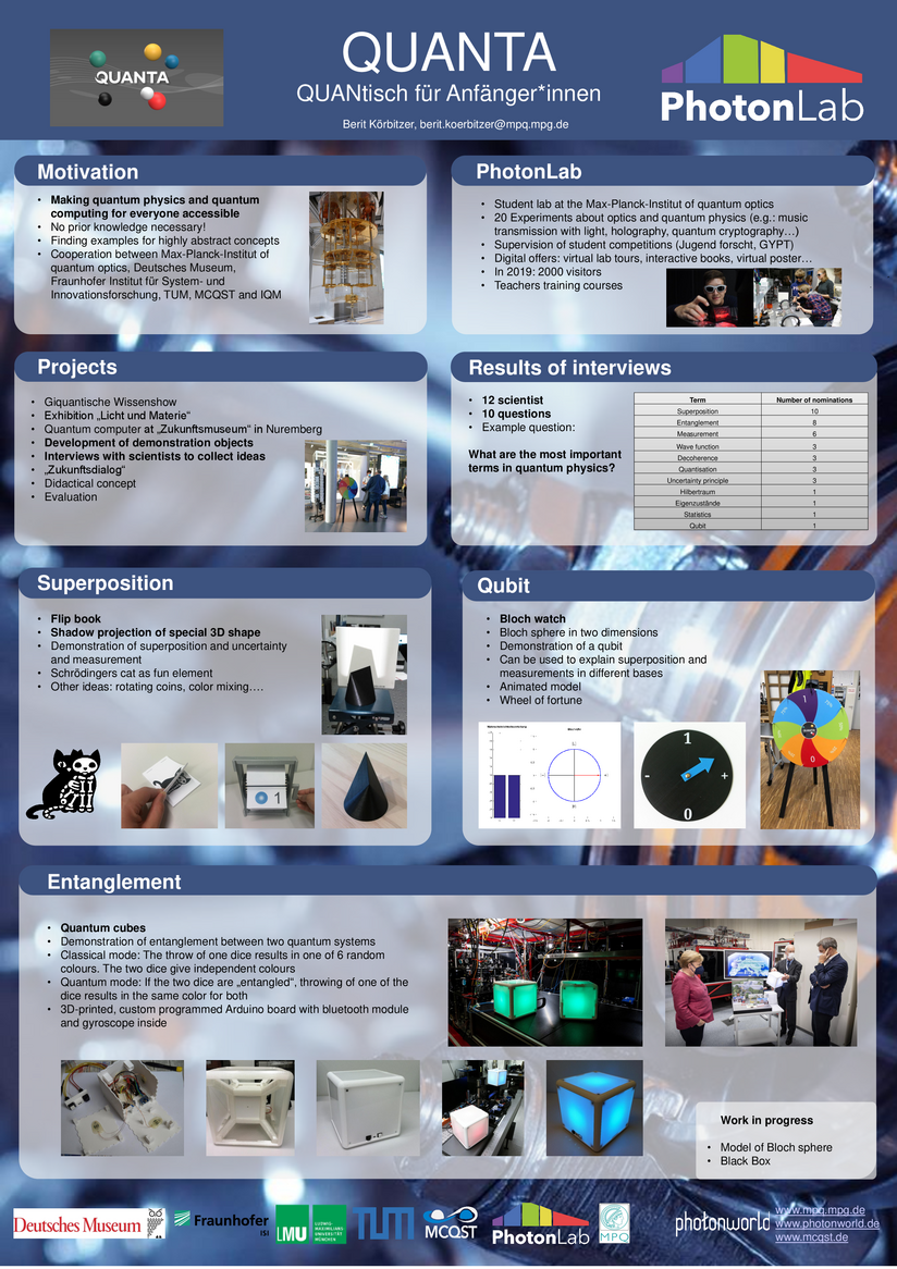 Über das Verbundprojekt QUANTA und den Exzellenzcluster MCQST ist auch das Deutsche Museum beteiligt, und entwickelt völlig neuartige Zugänge zur "mysteriösen Quantenwelt" für ein breites Publikum. Dr. Berit Körbitzer (Deutsches Museum und Max-Planck-Institut für Quantenoptik, QUANTA) wird auf dem Treffen den aktuellen Stand in der Entwicklung interaktiver Modelle von Konzepten wie Superposition, Qubits oder Verschränkung vorstellen. Eckhard Wallis (Deutsches Museum, MCQST) wird über die Planung der neuen Dauerausstellung „Licht und Materie“ geben, in der neben physikalischen Grundlagen auch ein Gefühl für den gesellschaftlichen Kontext der Quantenwissenschaften vermittelt werden soll.