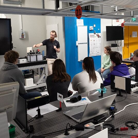 Für Oberstufenkurse, die die Quantenphysik vertiefen möchten, bieten wir einen Vertiefungskurs im Schülerlabor PhotonLab an (Flyer). Neben den normalen Experimenten zur Optik können Schüler:innen viele der im Unterricht oft nur theoretisch behandelten Versuche selbst im Rahmen von Analogieexperimenten durchführen. Darüber hinaus bekommen sie einen Einführungsvortrag in die Quantenphysik sowie Einblicke in Forschungsbereiche des MPQ. Im zweiten Teil des Programms werden die Funktionsweise und der Nutzen von Quantentechnologien, insbesondere Quantencomputern, thematisiert. In einem interaktiven Vortrag werden sowohl die grundlegende Funktionsweise als auch der Vorteil von Quantencomputern diskutiert. Als Abschluss wird in einem Demonstrationsexperiment gezeigt, wie einzelne Photonen erzeugt werden und diese mit sich selbst interferieren können.
