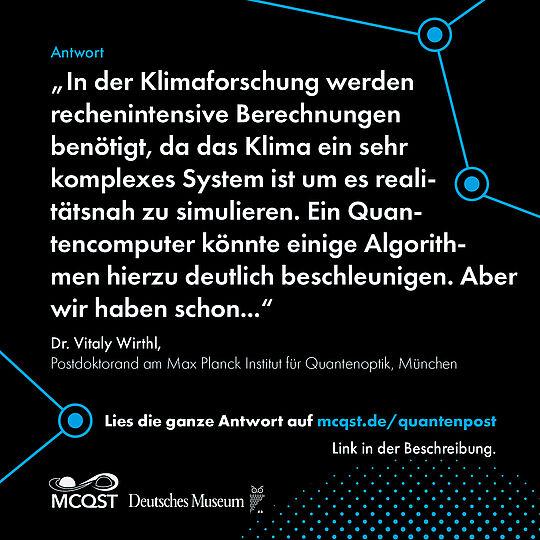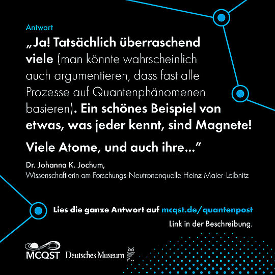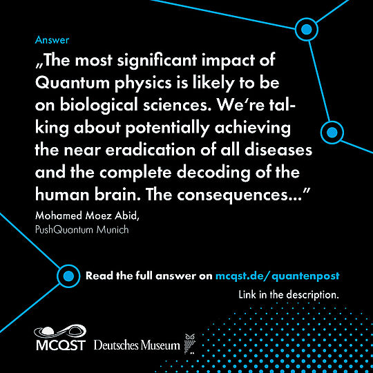 Begleitend dazu startete MCQST eine Social-Media-Kampagne, die gemeinsam mit dem Deutschen Museum und dem PhotonLab umgesetzt wurde. Unter dem Hashtag #quantentraeumen wurden ausgewählte Fragen und Antworten regelmäßig auf den verschiedenen Kanälen geteilt. Die Resonanz auf die Quantenpost war sehr groß und lieferte wertvolle Einblicke in die Neugier, Hoffnungen und auch Sorgen des Publikums. Dieses wachsende Repertoire an Fragen und Antworten wird künftig weiter ausgebaut und als Grundlage für neue Vermittlungs- und Beteiligungsformate genutzt.