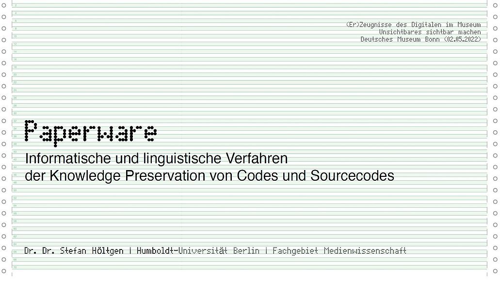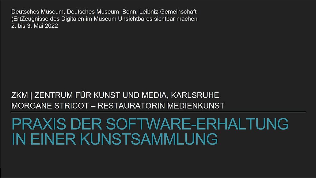 Infolge der informationstechnischen Durchdringung nahezu aller Gesellschaftsbereiche werden sich sowohl die historisch arbeitenden Geisteswissenschaften als auch Museen zunehmend mit medialen Umbrüchen hin zum Digitalen beschäftigen (müssen). In wachsendem Maße stehen alle Museen, deren Ausstellungsobjekte und Expertise das spätere 20. Jahrhundert umfassen, den Schwierigkeiten der Vermittlung von Digitalgeschichte gegenüber. Es stellt sich ganz konkret die Frage wie im musealen Kontext mit Software, für sich stehend oder als Teil eines physischen Objektes, umgegangen werden kann. Dabei geht es uns nicht um die Auswirkungen der Digitalisierung auf das Museum, weder um die digitale Repräsentation musealer Objekte, noch das Einbringen digitaler Medien in Ausstellungen. Diese Themen wurden im musealen Diskurs schon vielfach behandelt. Wir fragen stattdessen: Wie lässt sich das Unsichtbare sichtbar machen?