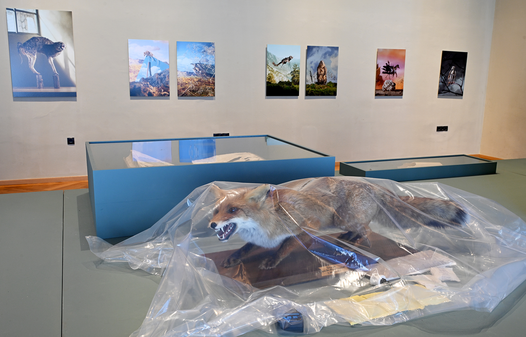 Ein ausgestopfter Fuchs in Plastikfolie eingehüllt, im Hintergrund sind die Bilder der Serie “Zeugnisse der Zerstörung” von Claus Pichler an der Wand zu sehen.