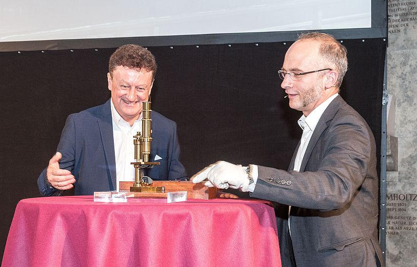 Generaldirektor Wolfgang M. Heckl und Timo Mappes, Gründungsdirektor des Deutschen Optischen Museums, mit dem ZEISS-Mikroskop "Stativ VIIb", das als neues Exponat in die Schatzkammer in die Ausstellung Klassische Optik kommt.
