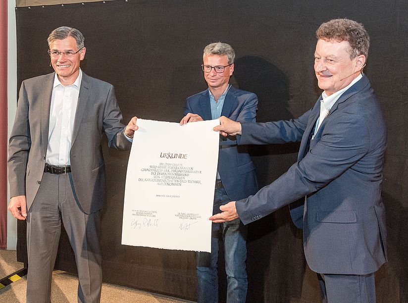 Die ZEISS Gruppe tritt dem Gründerkreis der Zukunftsinitiative bei: Karl Lamprecht, Vorstandsvositzender von ZEISS, Bayerns Wissenschaftsminister Bernd Sibler und Generaldirektor Wolfgang M. Heckl (v. li.) mit der unterzeichneten Urkunde im Ehrensaal des Deutschen Museums.