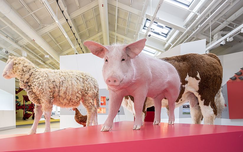Und weil in der Landwirtschaft und Ernährung der ganze Weg „vom Acker auf den Tisch“ betrachtet werden soll, wurden auch kontroverse Aspekte der Lebensmittelproduktion nicht ausgespart: „So muss jedem klar sein, dass für das Steak auf seinem Teller ein Tier gestorben ist. Deswegen zeigen wir auch einen Film, wo eine Kuh geschlachtet wird“, sagt Kuratorin Gerber. Allerdings läuft der nur auf Anforderung per Knopfdruck auf einem abgeschirmten Monitor. „Wir wollen die Leute ja nicht erschrecken und auch nicht missionieren“, so Gerber.