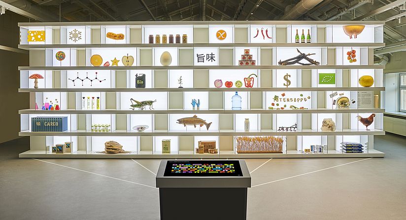 Das Lebensmittelregal kann über den Multimedia-Tisch im Vordergrund angesteuert werden. Dort gibt es auf Fingertipp Infos zu den Objekten im Regal.