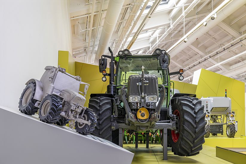 Ein moderner Fendt-Traktor und sein taktiles Modell (li.) in der neuen Ausstellung "Landwirtschaft und Ernährung".