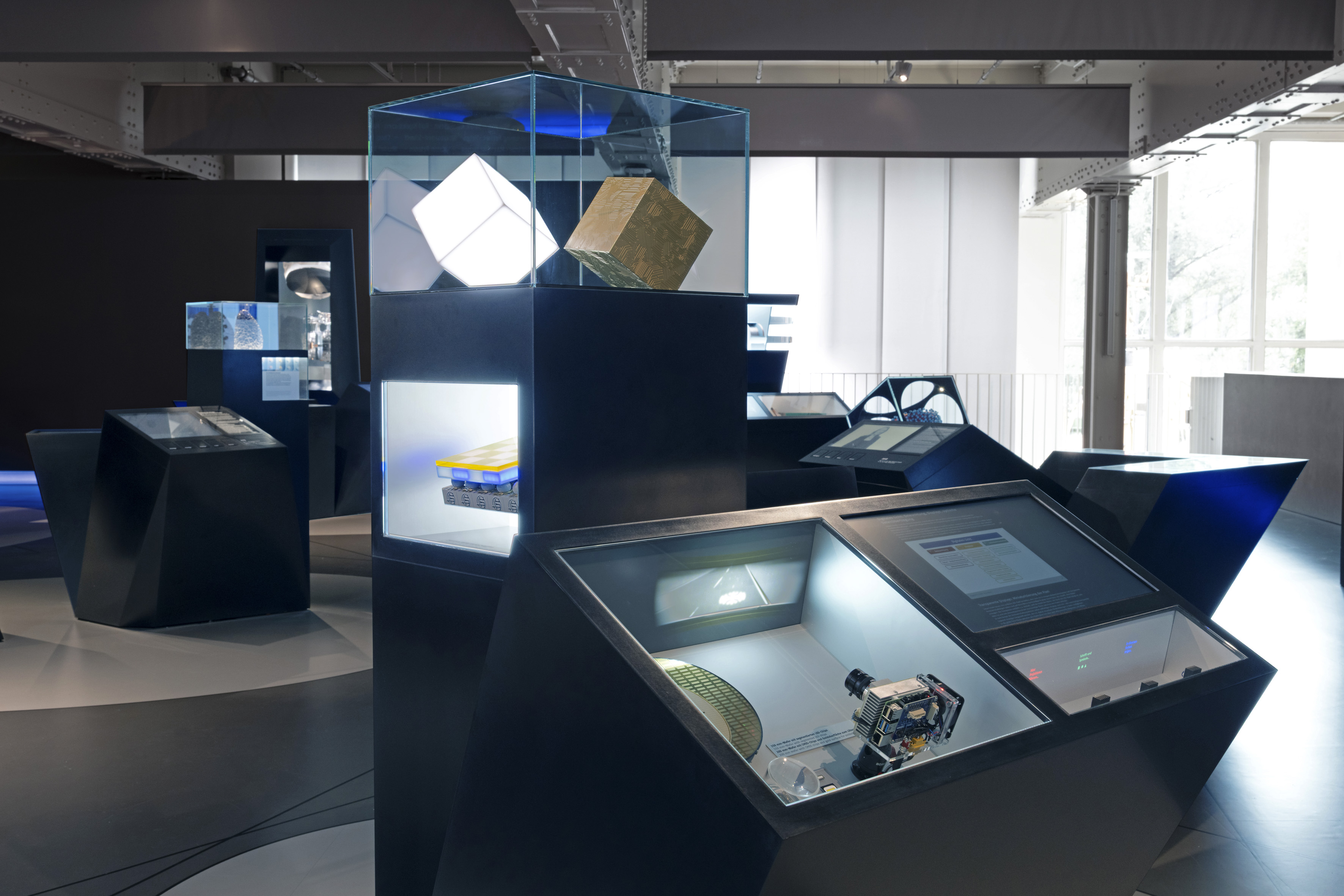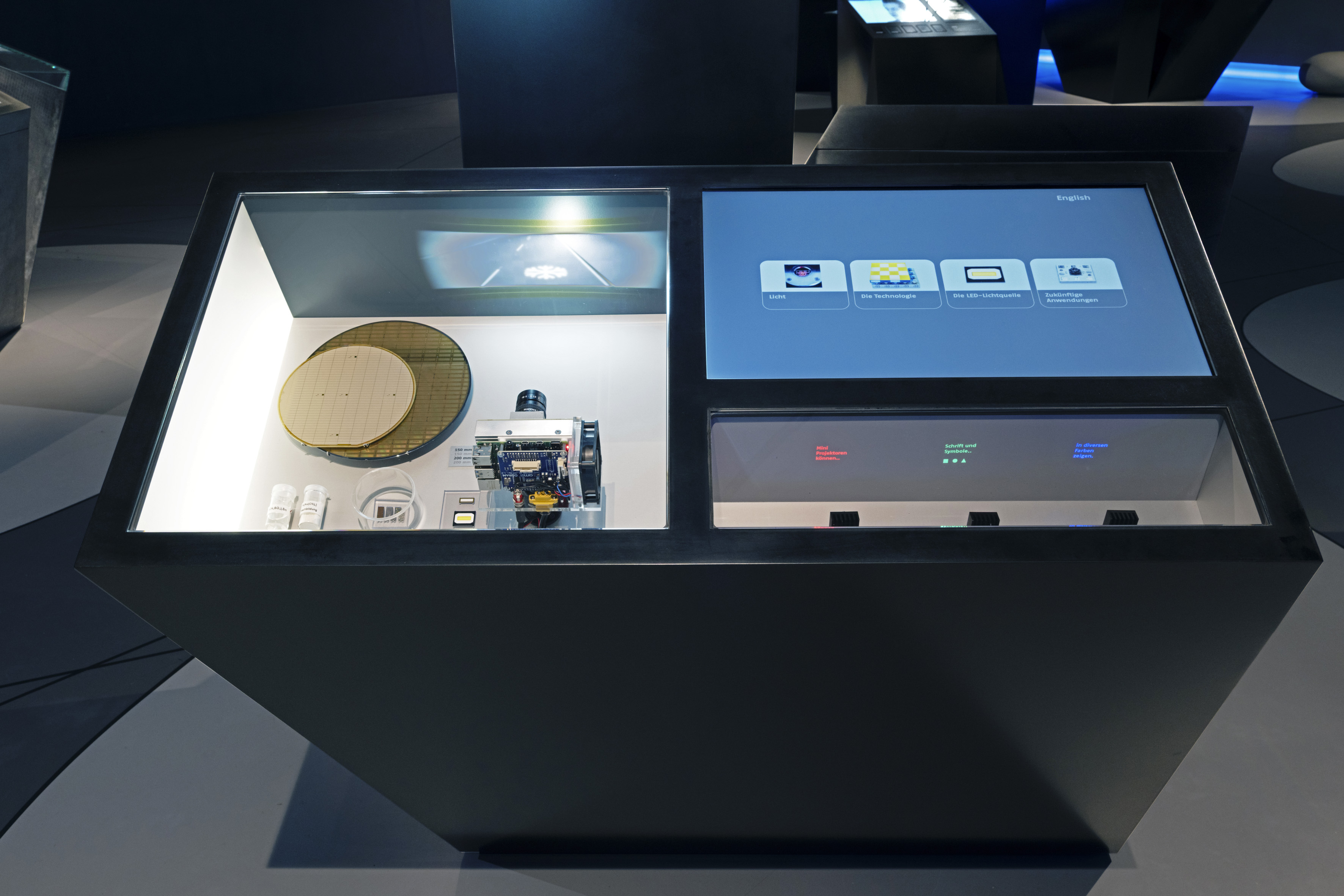 Die Vitrine mit den Wafern (li.) und den Miniprojektoren (re.).