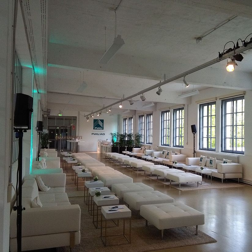 - Mobiliar: Stühle, Konferenztische, bis zu 30 Stehtische