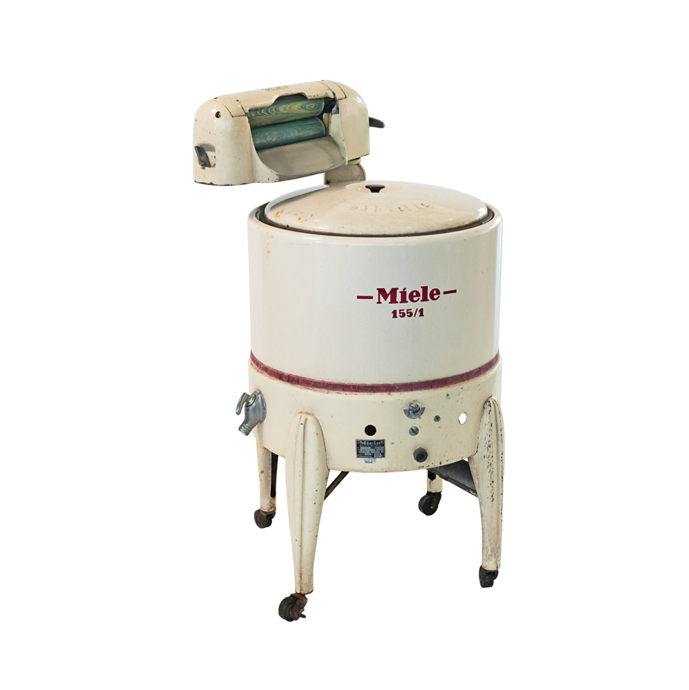 Solides Gerät für die Schwerstarbeit: eine Waschmaschine mit offener Trommel und einer Schraube zum Umwälzen der Wäsche. Nahm man die nasse Wäsche aus dem Bottich, konnte man sie durch die Mangel darüber drehen. Während der Bauzeit von 1945 bis 1967 wurden von diesem Modell mehr als 250 000 Stück produziert.