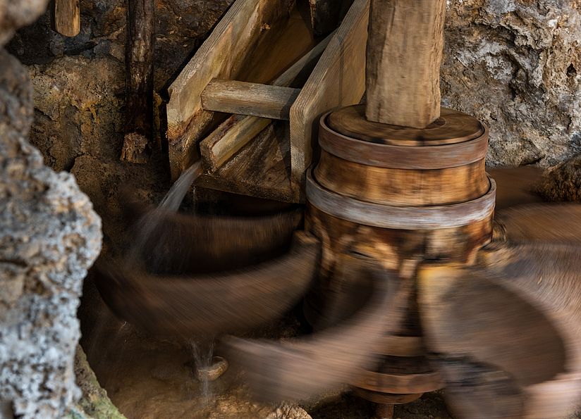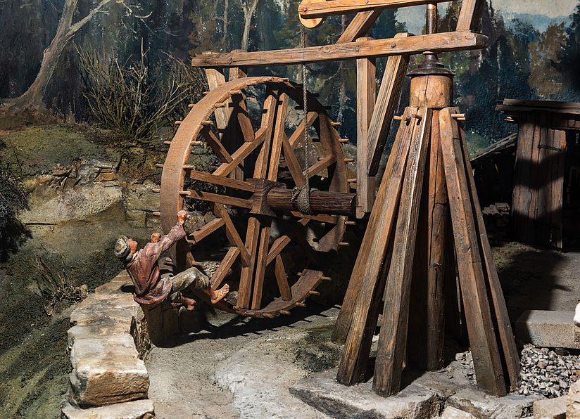 Ein Rad wird von der Kraft des Wassers gedreht. Mit der Drehung des Wasserrads wird wiederum etwas angetrieben, zunächst Mühlen und Wasserschöpfwerke. Seit dem 9. Jahrhundert verbreiteten sich unterschlächtige, also durch Wasser von unten angetriebene, Wasserräder in Europa. Ab dem 11. Jahrhundert konnte die Drehung des Wasserrads (über eine Daumen- oder Nockenwelle) in eine Hin- und Herbewegung umgewandelt werden. Damit konnte die Wasserkraft auch für Stampfvorrichtungen, Hämmer oder Blasebälge verwendet werden. Ab dem 14. Jahrhundert kam dann das leistungsstärkere oberschlächtige Wasserrad zum Einsatz. Beide Typen – das oberschlächtige und das unterschlächtige Wasserrad – können in der Ausstellung in Originalgröße betrachtet werden.