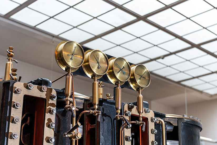 Nur eine Maschine war nie in einer Fabrik im Einsatz: Es ist die Watt'sche Dampfmaschine, die erst im frühen 20. Jahrhundert für das Deutsche Museum nachgebaut wurde. Das Original war zur Zeit der Museumsgründung schon seit über 40 Jahren im South Kensington Museum. Dafür zeigt unser Exemplar so ziemlich alles, was bei Boulton & Watt im Lauf der Zeit sonst noch für die Dampfmaschine entwickelt wurde. Zum Beispiel ein sogenannter Indikator, der erstmals die wechselnden Druckverhältnisse im Zylinder aufzeichnen konnte und somit der Urahn aller Sensoren im Inneren von Maschinen ist.