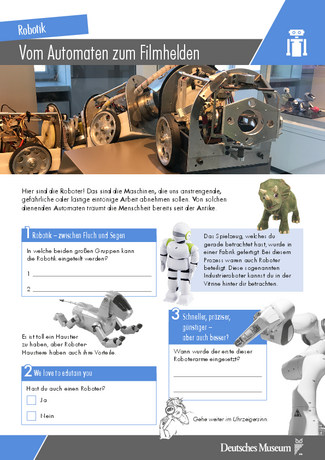Hier sind die Roboter. Das sind die Maschinen, die uns anstrengende, gefährliche oder lästige eintönige Arbeit abnehmen sollen. Von solchen dienenden Automaten träumt die Menschheit bereits seit der Antike. Mit der Idee sind Hoffnungen auf mehr Wohlstand, Komfort und menschlichere Arbeitsbedingungen verbunden, aber auch Ängste vor Jobverlust, Armut und Fremdbestimmung. Der Begriff „Roboter“ wird dabei zuerst in der Literatur erwähnt, in Karel Čapeks Science-Fiction-Drama „R.U.R Rossum's Universal Robots“ von 1920. Die Popkultur hat unser Roboterbild stark geprägt. Mit R2-D2, Baymax oder dem Terminator haben die meisten echten Roboter allerdings wenig gemein, wie man in dieser Ausstellung sehen kann.