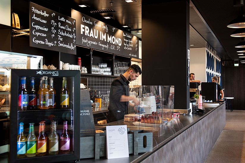 Entspannt einen Kaffee trinken oder beim Mittagsmenü feine Speisen genießen. Unsere Dachterrassen Gastronomie liegt auf Ebene 2 und bietet einen grandiosen Blick über die Stadt.
