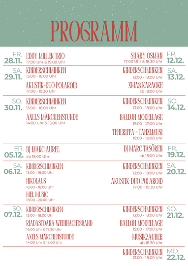 Mit liebevoll dekorierten Buden, glitzernden Lichtern und dem Duft von Glühwein, Punsch und winterlichen Spezialitäten wird das Winterdorf zu einem ganz besonderen Treffpunkt in der Adventszeit. Auch für Unterhaltung ist gesorgt: Ein abwechslungsreiches Programm mit musikalischen Highlights, kleinen Überraschungen und besonderen Momenten sorgt für festliche Stimmung.