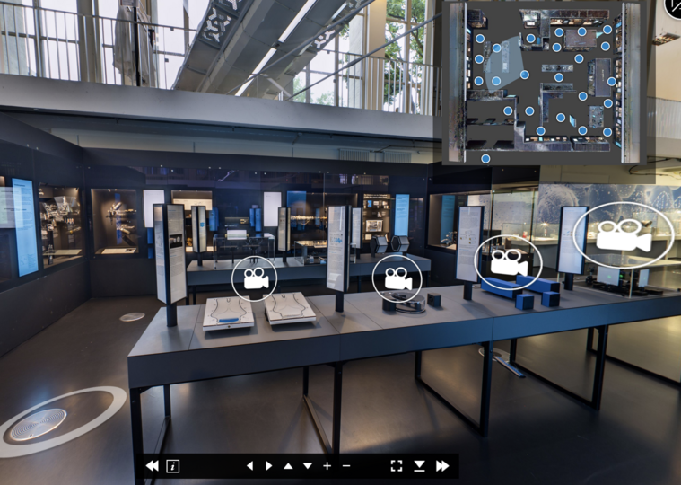 Lageplan der Ausstellung oben rechts und Steuerungselemente für den Rundgang unten im Browserfenster. Bild: Screenshot Virtualtour, Deutsches Museum