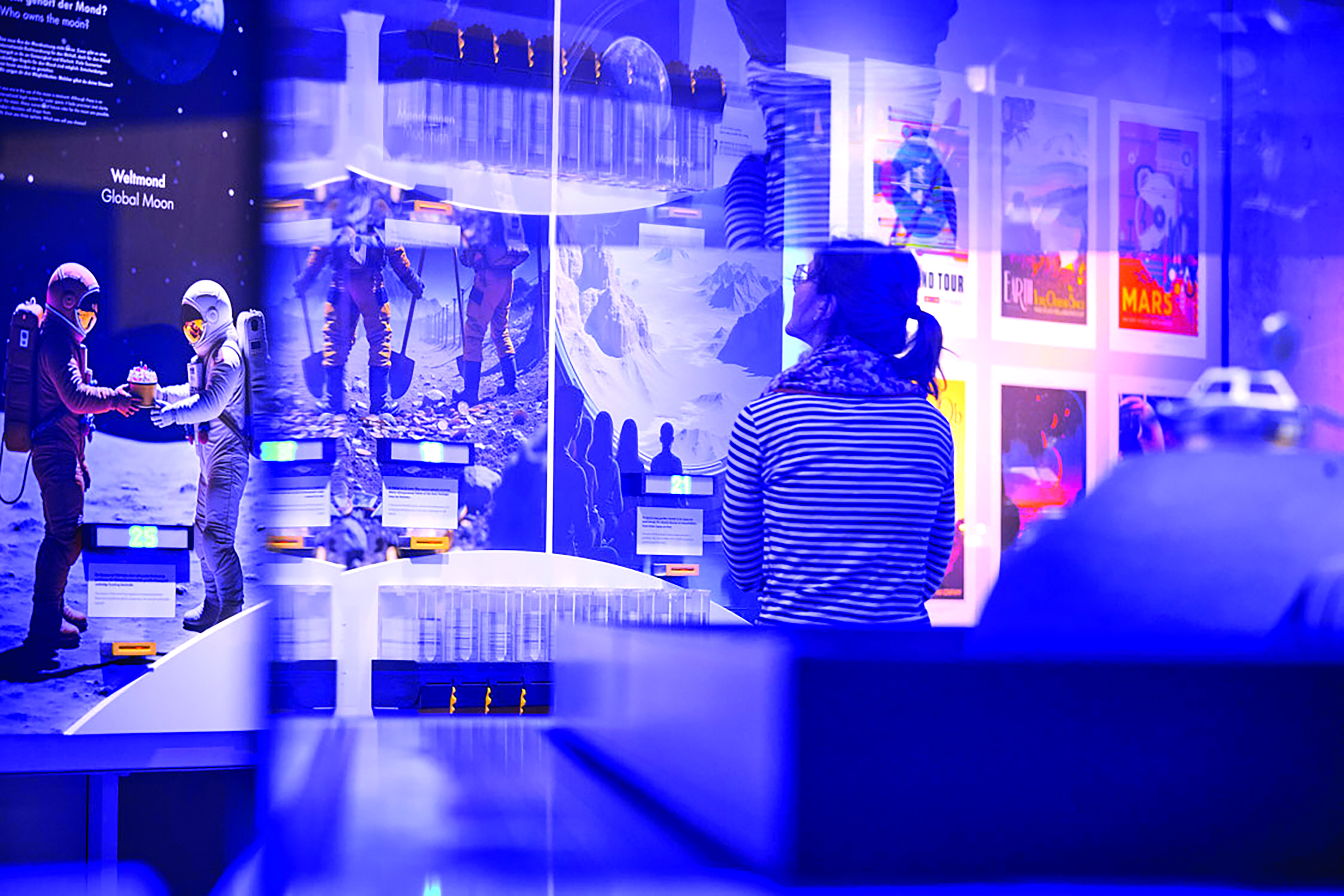 Die Neupräsentation „Weltraumrecht“ stellt drei Szenarien für den Mond vor: Weldmond, Mondrennen und Mond pur. Sie ergänzt die Dauerausstellung im Themenbereich Raum und Zeit, in der unter anderem das Moon Village zu sehen ist – ein eindrucksvolles Modell als Beispiel, wie Menschen auf dem Mond leben und arbeiten könnten. An einer Telefonzelle können die Museumsgäste vom Mond zur Erde telefonieren und erleben die verzögerte Übertragung mit 1,3 Sekunden. Großformatig projizierte Ausschnitte aus Science Fiction-Filmen zeigen, dass der Mond schon immer eine Anziehungskraft auf den Menschen hatte und zu Gedankenexperimenten eingeladen hat.