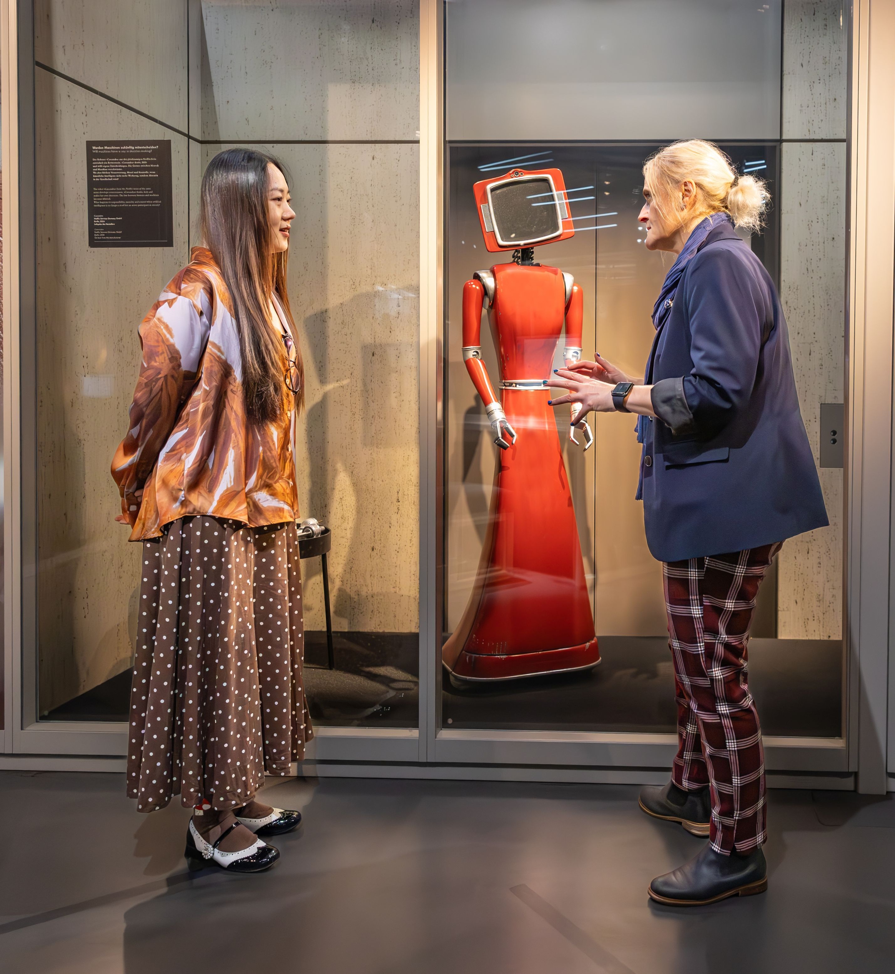 Marion Grether nahm die Studierende spontan mit auf eine Führung durchs Haus. Passend zu „Cassandra“ ging es um die unterschiedlichen Roboter-Typen, die das Museum in der Dauerausstellung zeigt, um Mensch-Maschine-Interaktion und um künstliche Intelligenz. Den Abschluss bildete ein Besuch im Labor des Museums, wo unter anderem Workshops zur Roboter-Programmierung angeboten werden.