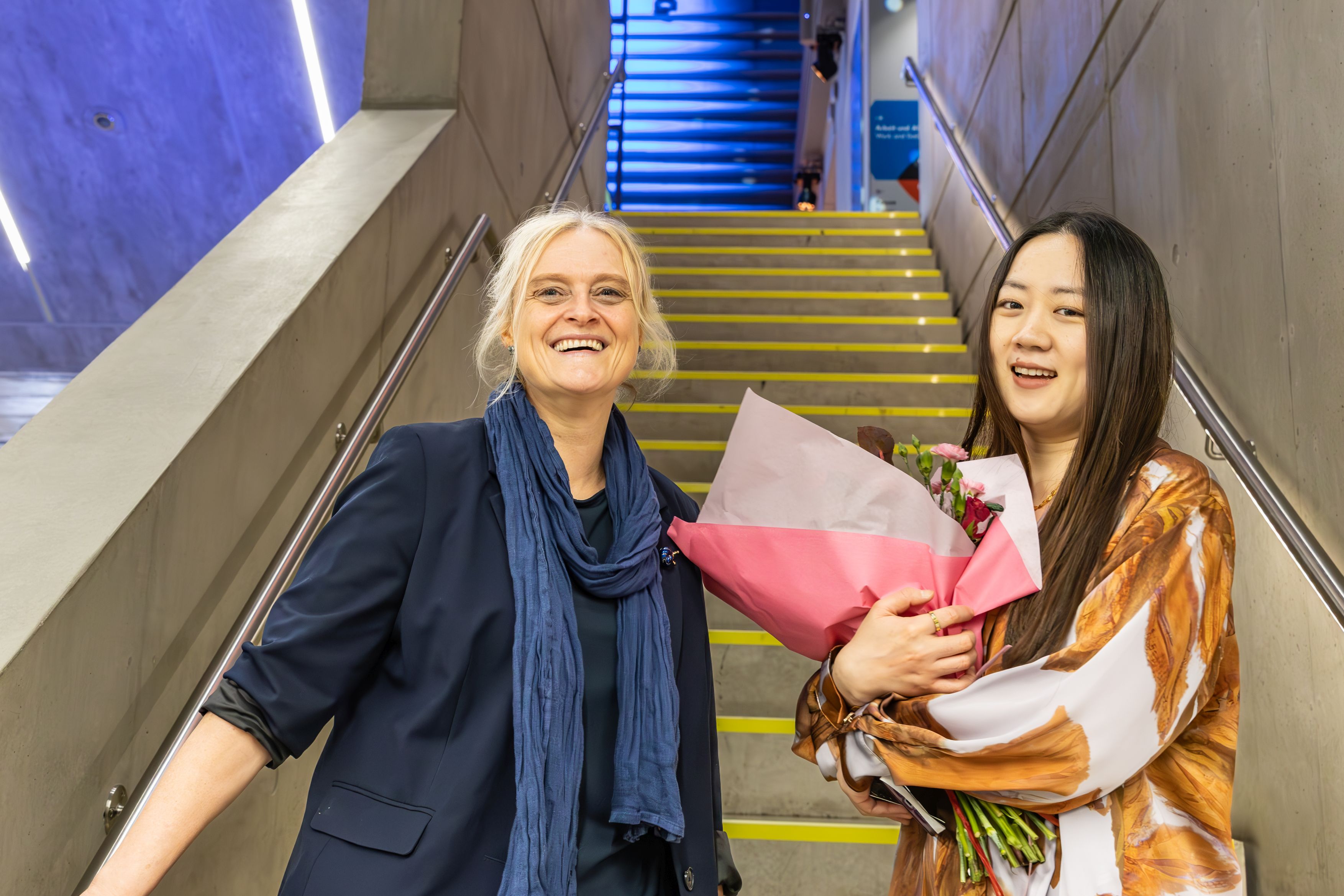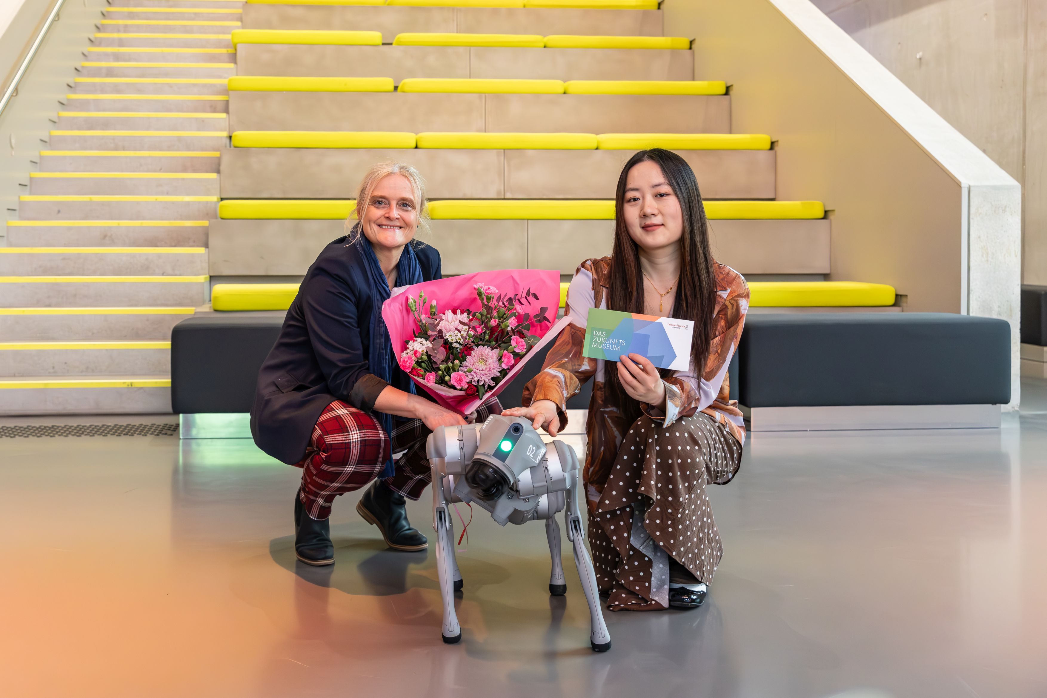 Neben dem exklusiven Rundgang erhielt Frau Liu einen Blumenstrauß, eine Jahreskarte für das Zukunftsmuseum und zwei Tickets für die Premiere von „smart aber herzlich“ überreicht.